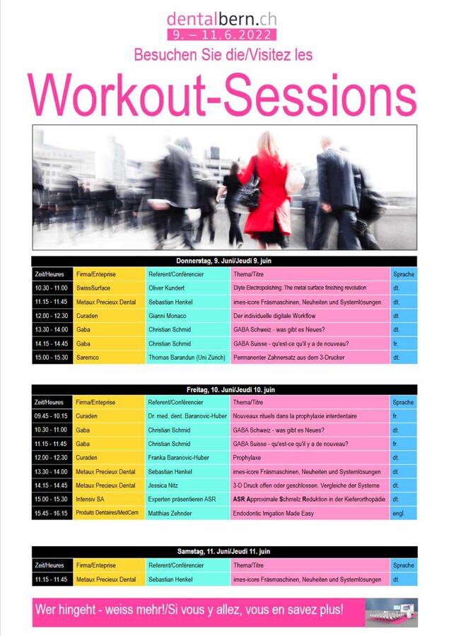 Neu an der DENTAL BERN: Die Einführung der neuen Workout-Sessions, die an allen drei Messetagen angeboten werden, folgt dem Leitsatz der Dentalschau: «Wer hingeht - weiss mehr!» Hier haben Unternehmen jeweils 30 Minuten Zeit, Wissenswertes, Hintergründe, Expertisen und Teile ihrer Produktpalette zu präsentieren.